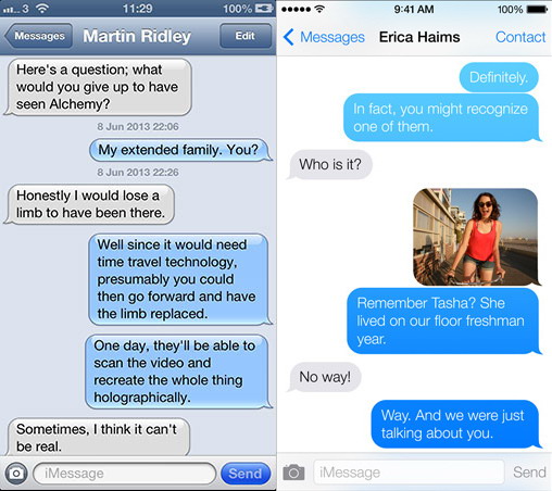 iOS 7的颜色和边界在这个应用上有很明显的区别。iOS 7舍弃了边界,依靠色彩来体现交互、信息的分隔;相应地控制也变成了隐形的,基于标签或者图标以及主题颜色(每个应用都有不同,联系人用蓝色、 音乐用红色、 笔记用黄色)的控制。另外细长的字体并不是所有人都看得惯,但是事实就是之前iOS 6那个边框就这样被移开了。