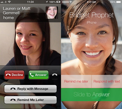 之前的凸凹变化、握柄、压花、阴影、内发光、硬按钮边界等设计元素占去了60%的显示屏空间。新版本则直接让你看到来电者的大照片,旁边有几个选项(字符)挂在旁边可供你选择。